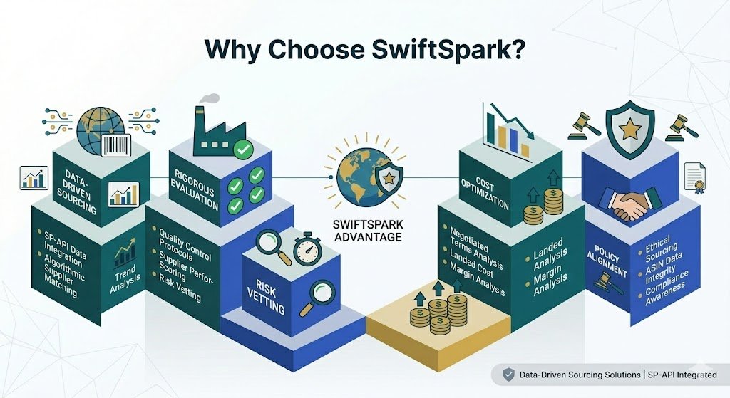 Choose SwiftSpark for structured, research-driven product sourcing support tailored for Amazon sellers. Our team assists throughout the sourcing lifecycle — from supplier discovery and evaluation to quality planning and cost analysis.